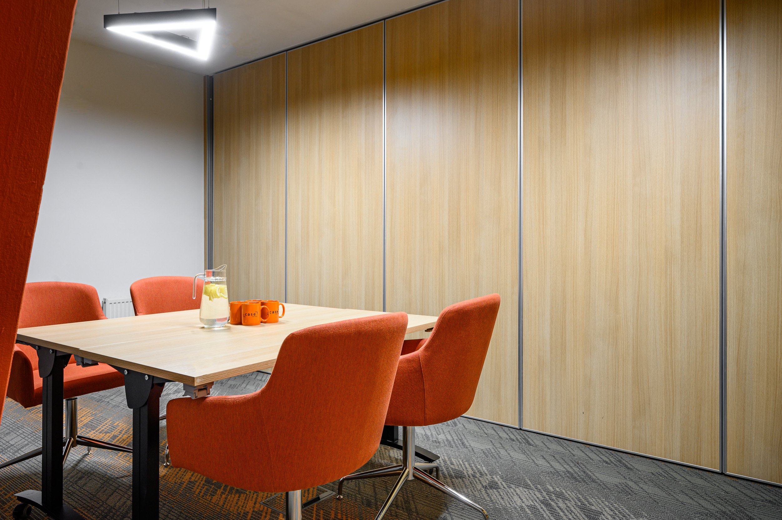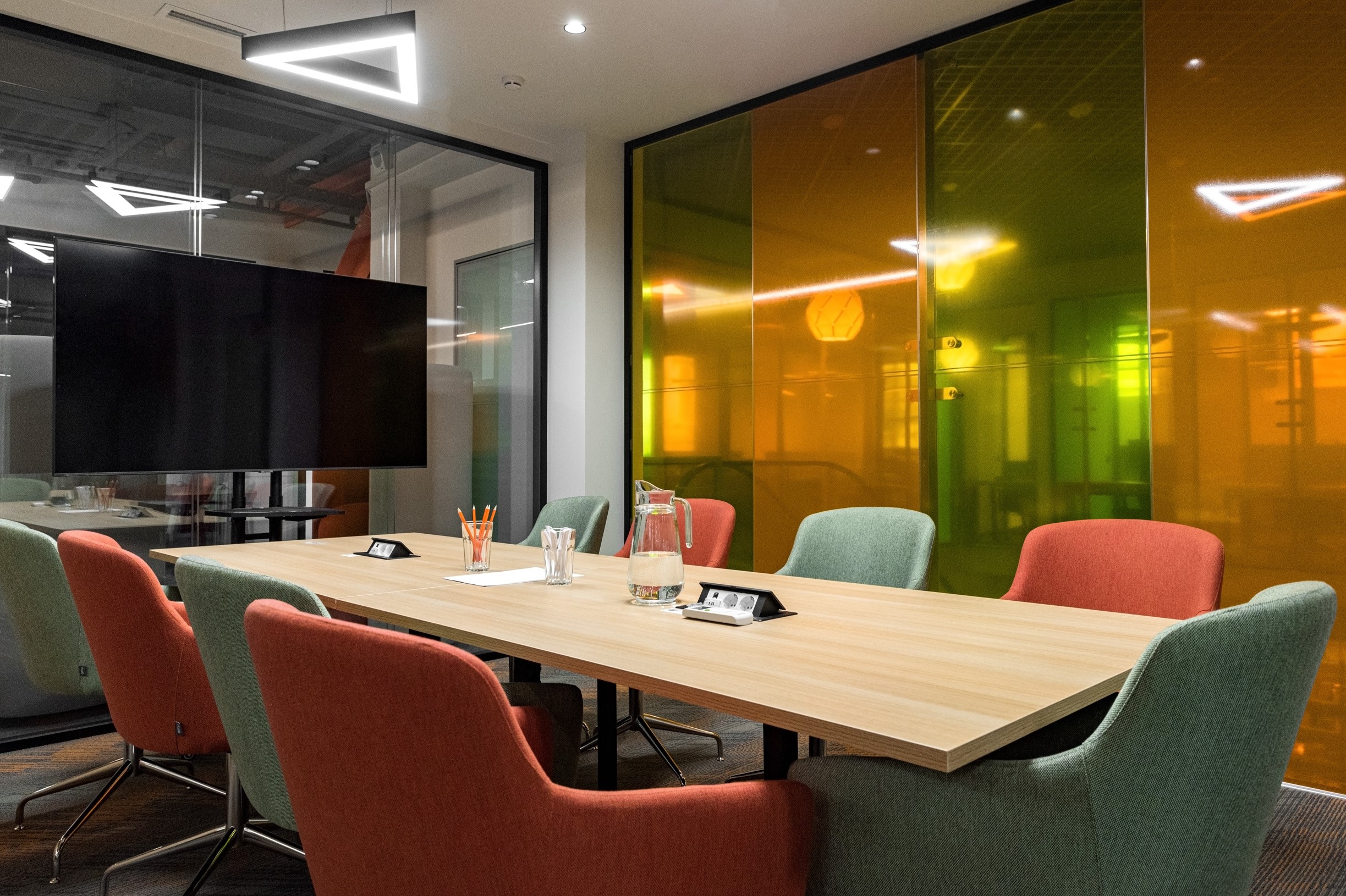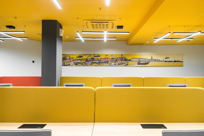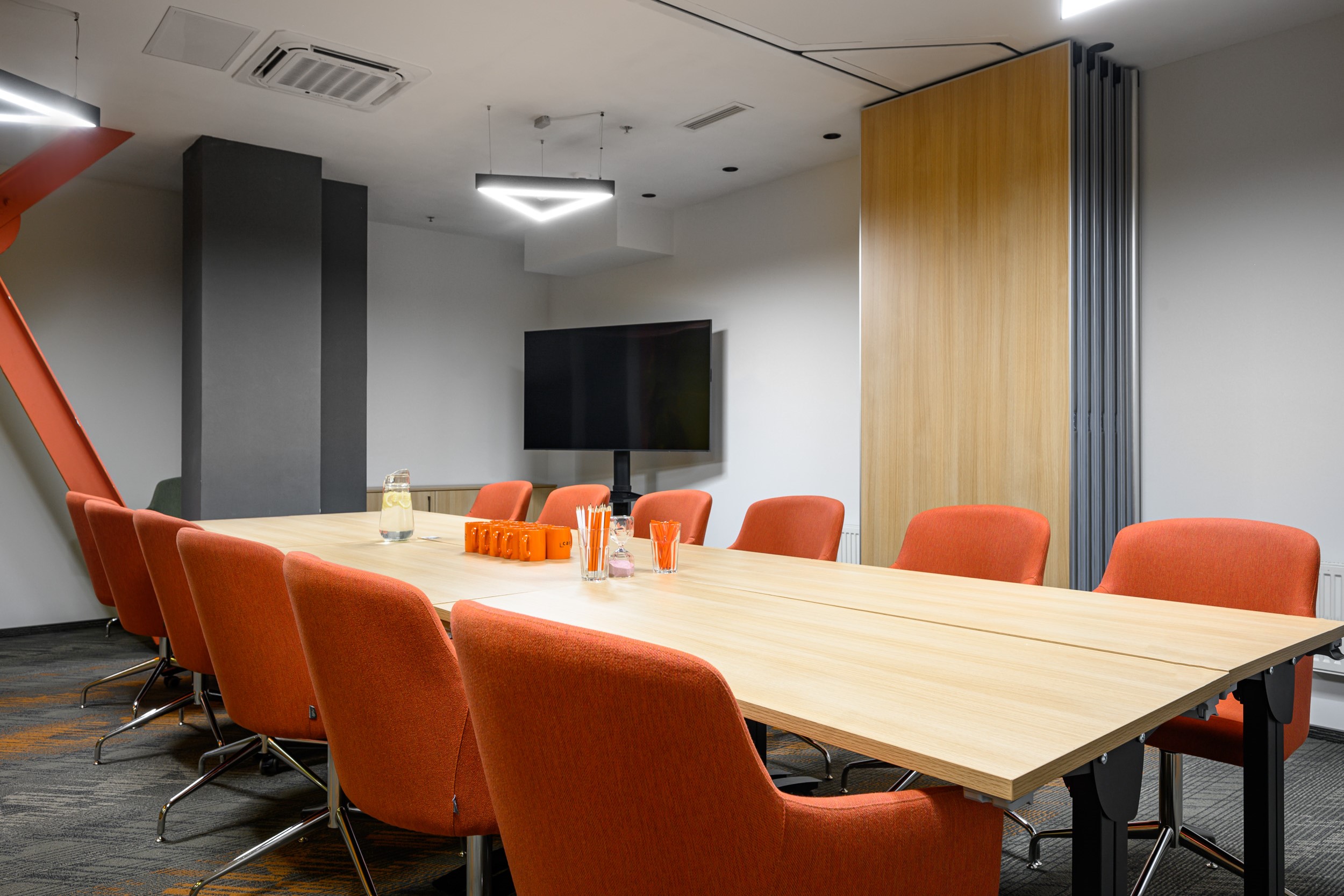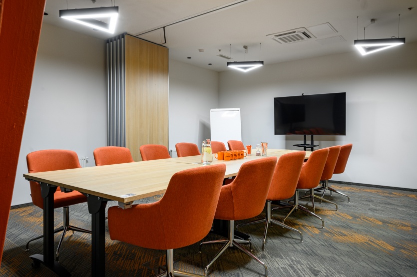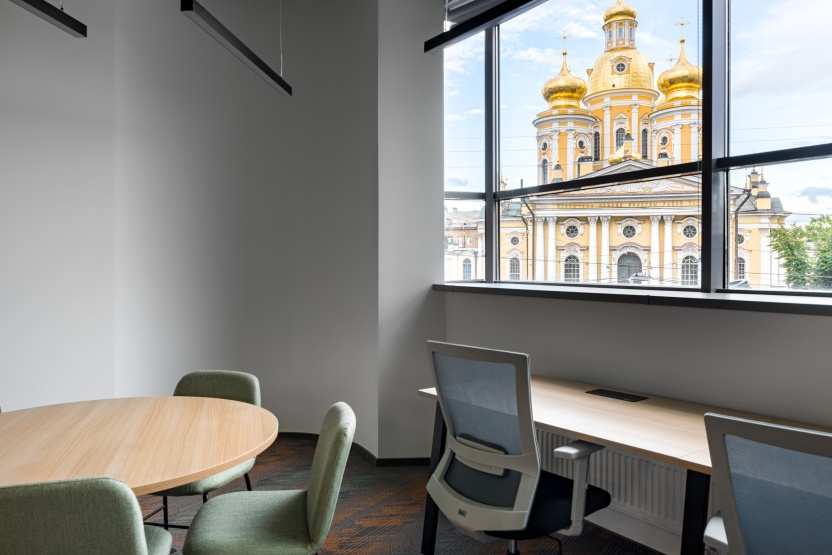 Переговорные комнаты оборудованы необходимой видео и аудио-техникой. Переговорные подойдут и для онлайн-встреч. Всего в коворкинге располагается 3 переговорных на 10 мест каждая. Комнаты под названиями "Владимирская" и "Достоевская" оснащены трансформируемой перегородкой, что позволяет объединить их в единое пространство. Комната "Пять углов" располагается в дальнем блоке пространства.