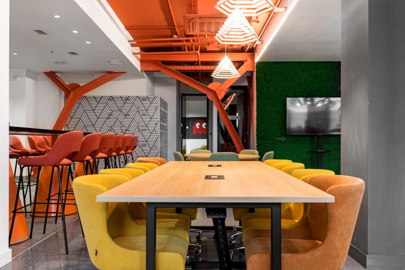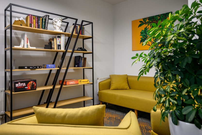 Мы предлагаем не просто рабочие места, а особую атмосферу, которая вдохновит на достижение целей. Для работы вы можете арендовать рабочее место, отдельный офисный блок, переговорную комнату. А отдохнуть всегда можно в комнате отдыха с небольшой библиотекой или в игровой комнате, где есть настольный футбол и Sony Play Station 5.