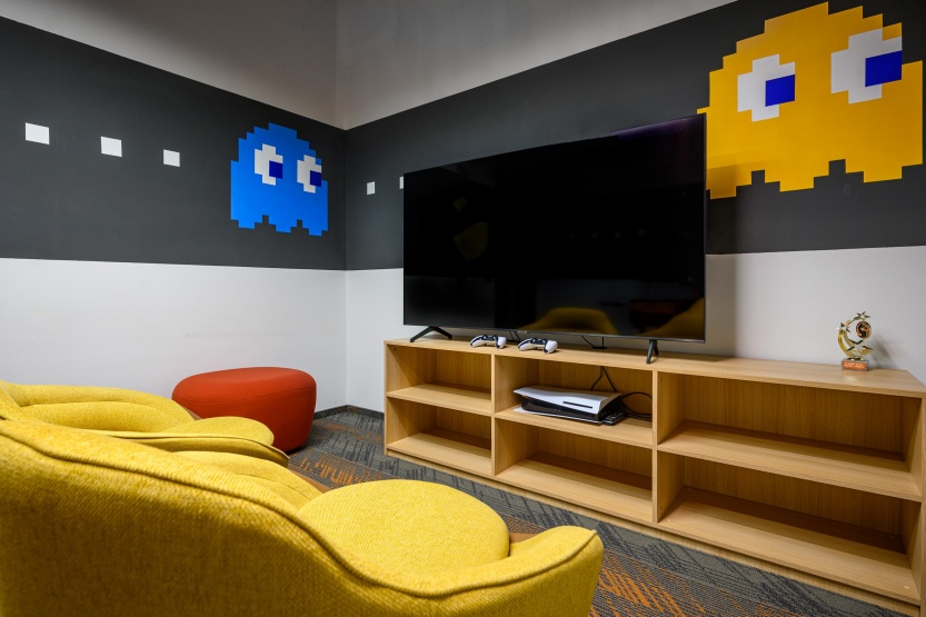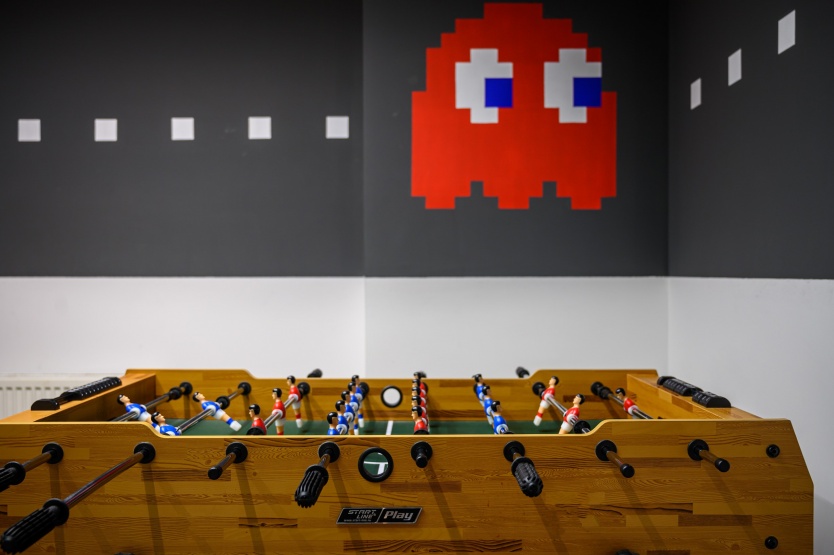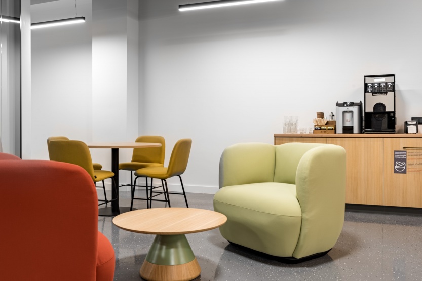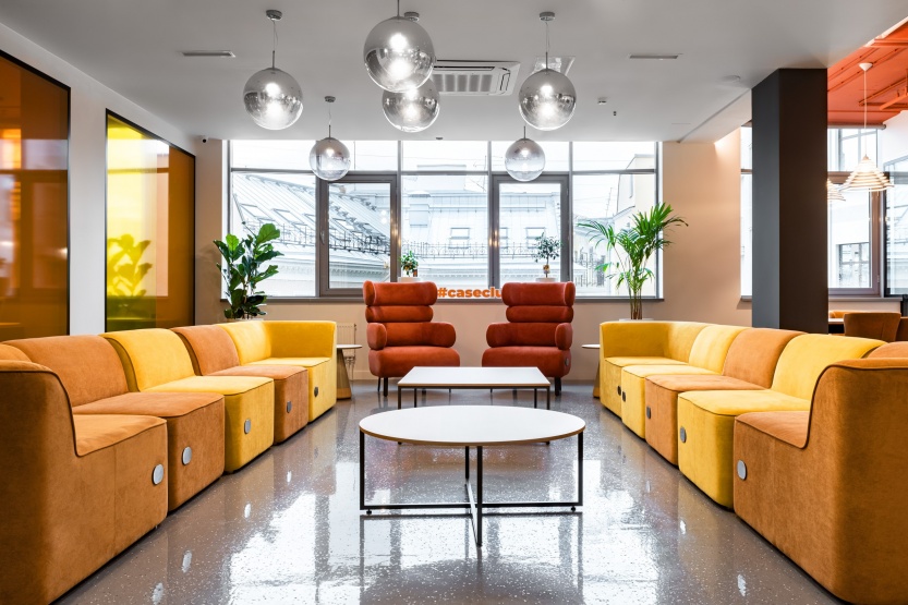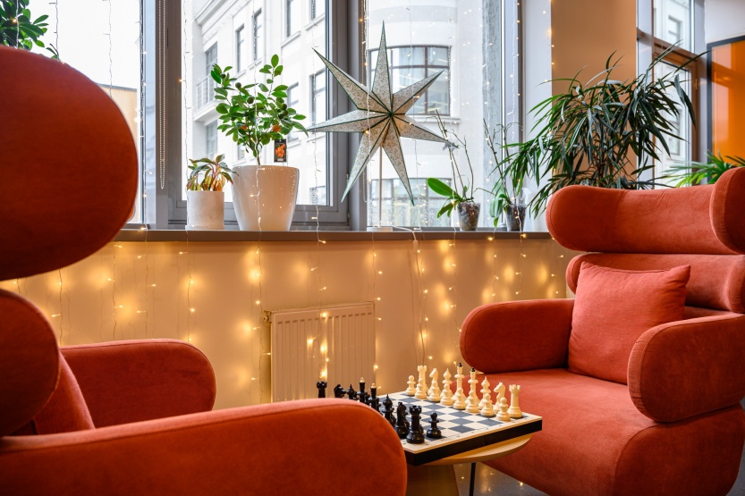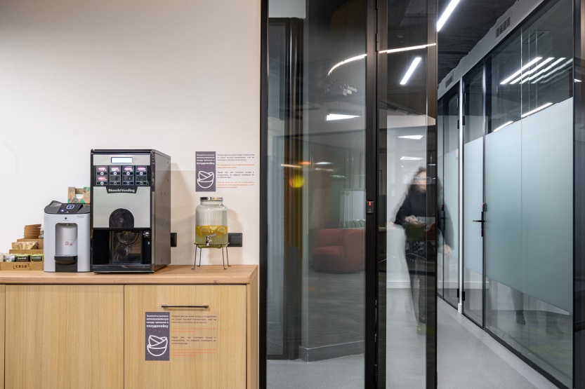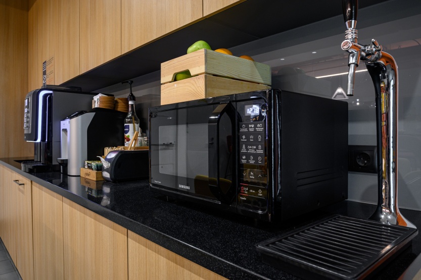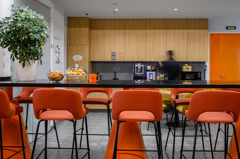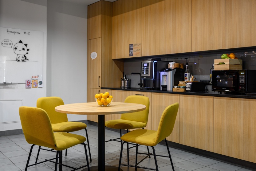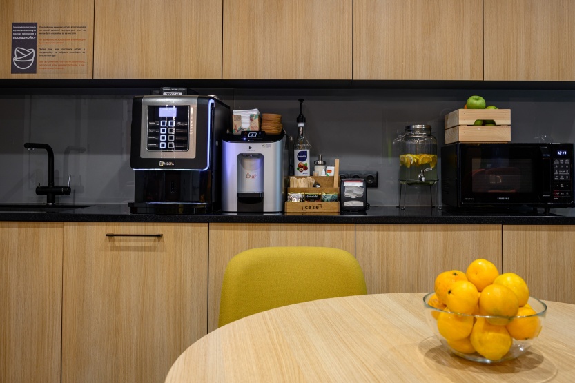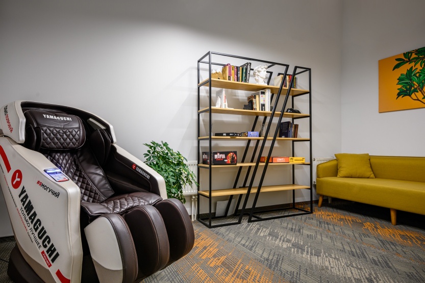 Общие зоны создают особую атмосферу в нашем пространстве. Они дают возможность для отдыха нашим резидентам. Зоны разделены на разные функции: reception, общая кухня, две точки coffee-point в среднем и дальнем блоках, комната отдыха с небольшой библиотекой, настольными играми и массажным креслом, а также игровая с настольным футболом и Sony Play Station 5. По пятницам на кухне открывается пивной кран.