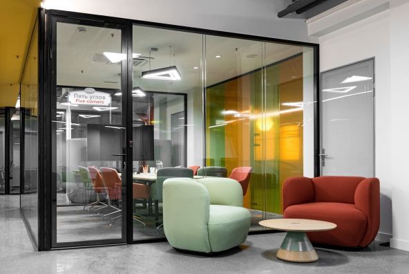 Переговорные комнаты оборудованы необходимой видео и аудио-техникой. Переговорные подойдут и для онлайн-встреч. Всего в коворкинге располагается 3 переговорных на 10 мест каждая. Комнаты под названиями "Владимирская" и "Достоевская" оснащены трансформируемой перегородкой, что позволяет объединить их в единое пространство. Комната "Пять углов" располагается в дальнем блоке пространства.